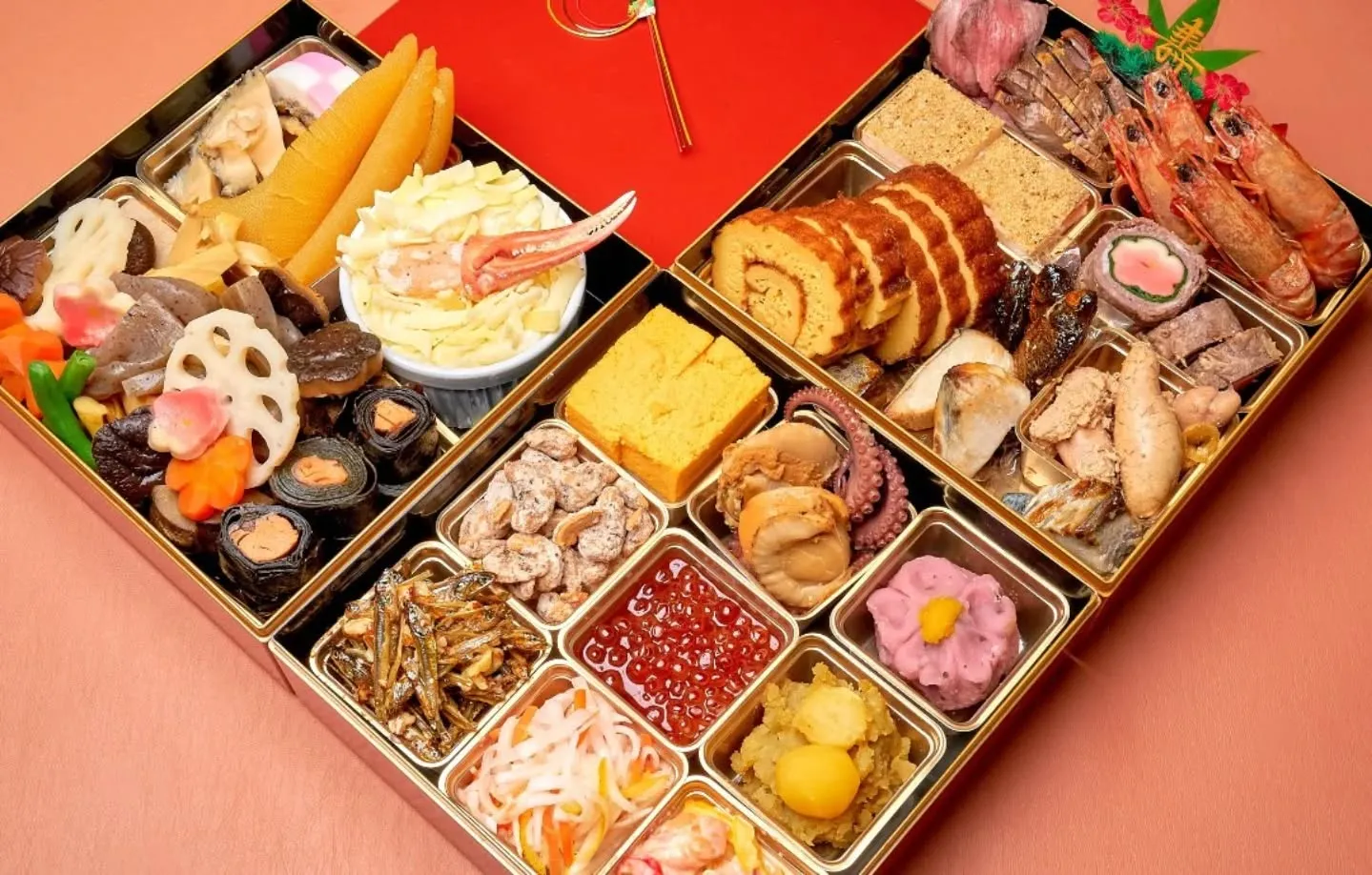◎サーモンマリネ◎紅白なます◎ナッツ田作り◎栗きんとん◎いくら醤油漬け◎カシューナッツ怪味◎手作り和菓子◎黒豆◎錦玉子◎和風ローストビーフ◎鴨燻製◎花麩牛肉巻き◎海老つや煮◎海老松風焼き◎伊達巻き◎さわら西京焼き◎鮒甘露煮◎助子旨煮◎紅白蒲鉾◎あわび旨煮◎数の子◎贅沢蟹グラタン◎鮭昆布巻き◎梅田ごぼう◎お煮しめ 8種類 全32品